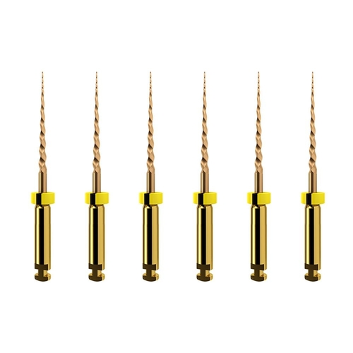 Guldfärgad roterande rotkanalsfil av specialbehandlad nickeltitan för maskinell rensning.