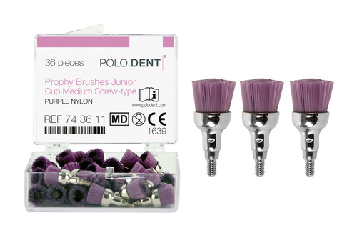 PoloDent pensel, profylaktisk nylonborste av skruvtyp. Liten storlek för barn. Färgkodad med 3 olika hårdheter: mjuk, medium och hård. Lämplig för t.ex. rengöring av missfärgade tänder. Max. varvtal. 10 000.