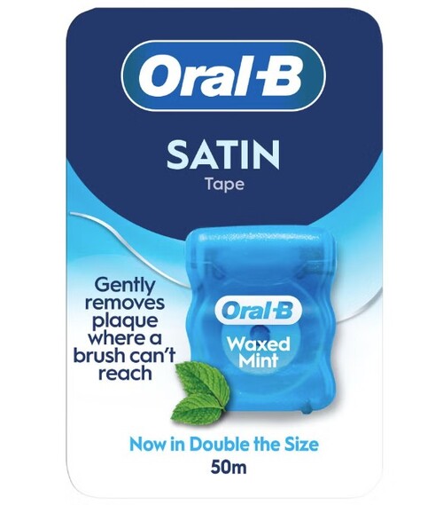 Oral-B Satin Floss är en vaxad tandtråd i ett bredare "tejp"-format, utvecklad för effektiv rengöring av interdentalrum – även i trånga kontaktpunkter. Som ett komplement till den dagliga tandborstningen.
